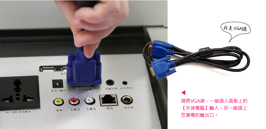step2. 請將VGA線接頭,一端插入面板上的【外接電腦】輸入口。音源線接頭,一端插入面板上的【電腦音頻】輸入,