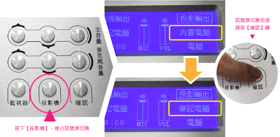 由數位講桌面板顯示,可以看出訊號來源是否由 [ 內置電腦 ] > [ 筆記電腦 ] ,確認切換完成,請按下【確認】鍵。