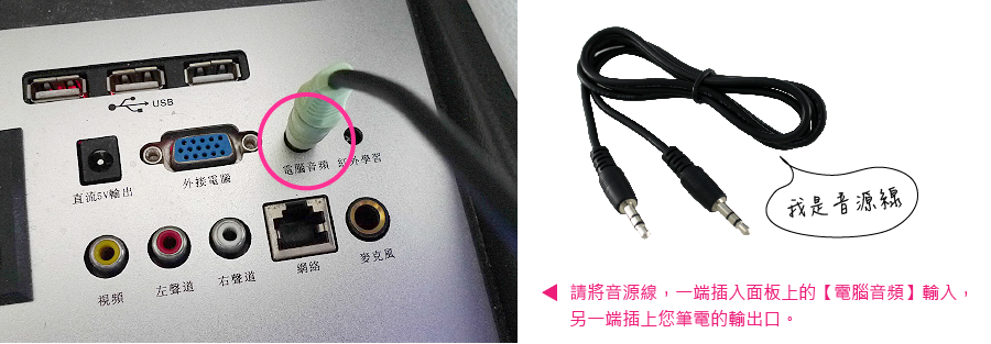 step4. 請將音源線,一端插入面板上的【電腦音頻】輸入,另一端插上您筆電的輸出口。