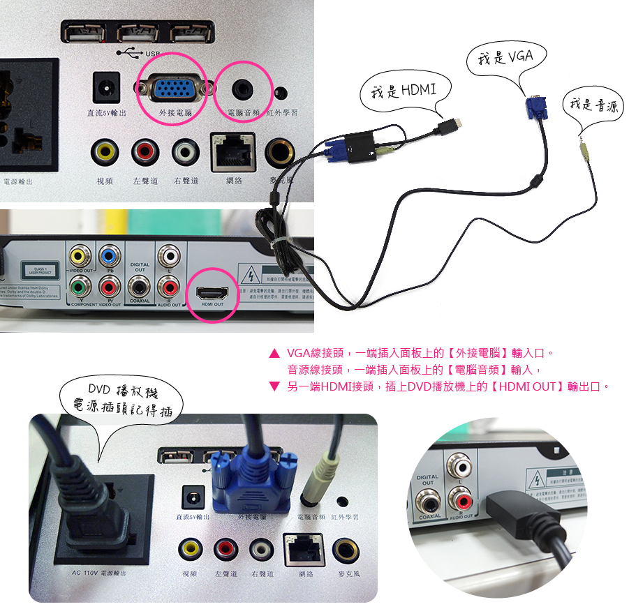 另一端HDMI接頭,插上DVD播放機上的【HDMI OUT】輸出口。