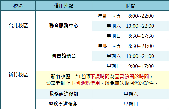 台北校區聯合服務中心、新竹校區圖書館開放時間,如下表: