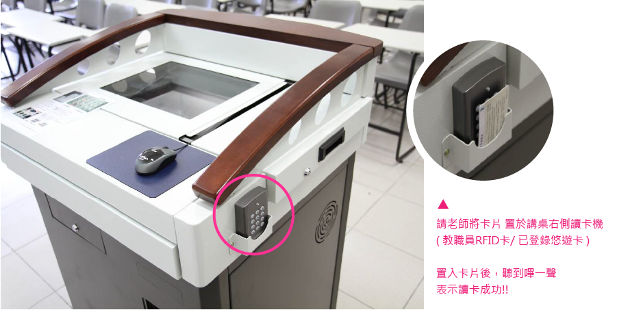 step1. 請老師將卡片( 教職員RFID卡/ 已登錄悠遊卡 ), 置於講桌右側讀卡機。置入卡片後,聽到嗶一聲,表示讀卡成功!!