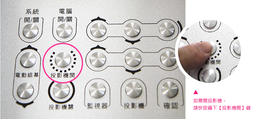step1. 電腦開機後,如需開投影機,請快按兩下【投影機開】鍵