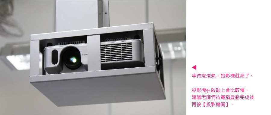 step2. 等待燈泡熱,投影機就亮了。投影機在啟動上會比較慢,建議老師們待電腦啟動完成後,再按【投影機開】。